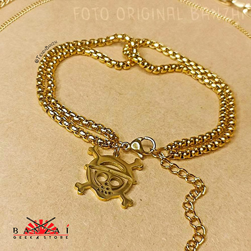 ¡Muestra tu lealtad a la tripulación del Sombrero de Paja con este elegante conjunto de collar y pulseras! Elaborados en acero inoxidable dorado de alta calidad, estos accesorios presentan el icónico Jolly Roger de los Mugiwara con un diseño detallado y resistente. Un toque de estilo pirata para tu look diario.