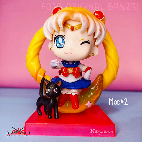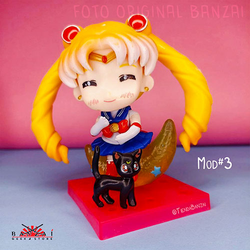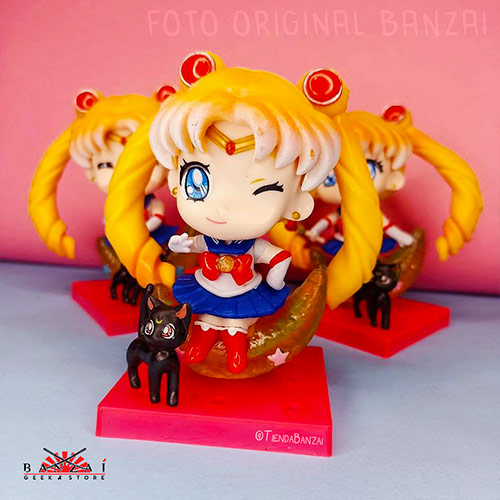 - Diseño Adorable: Estas figuras presentan tres expresiones kawaii de la tierna Sailor Moon con tu uniforme en una versión chibi, sentada sobre una luna dorada como su báculo, además acompañada de la gatita Luna.